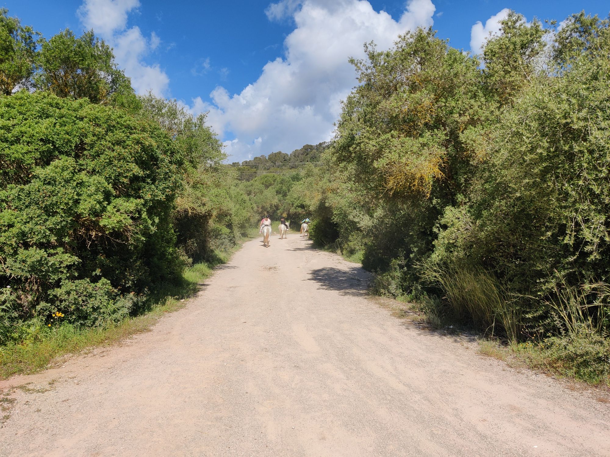 From the shrine, continue straight ahead, following the dirt track. Soon you’ll reach a busy asphalt road that needs to be crossed. Take care here, as cars travel fast in both directions. Once across, the path widens slightly and begins to ascend gently toward the northwest. The surroundings become quieter, with sparse pine trees and views opening toward Alcudia Bay. After about 1.2 kilometers, you’ll reach a crossroad where there is a stone wall on your left.