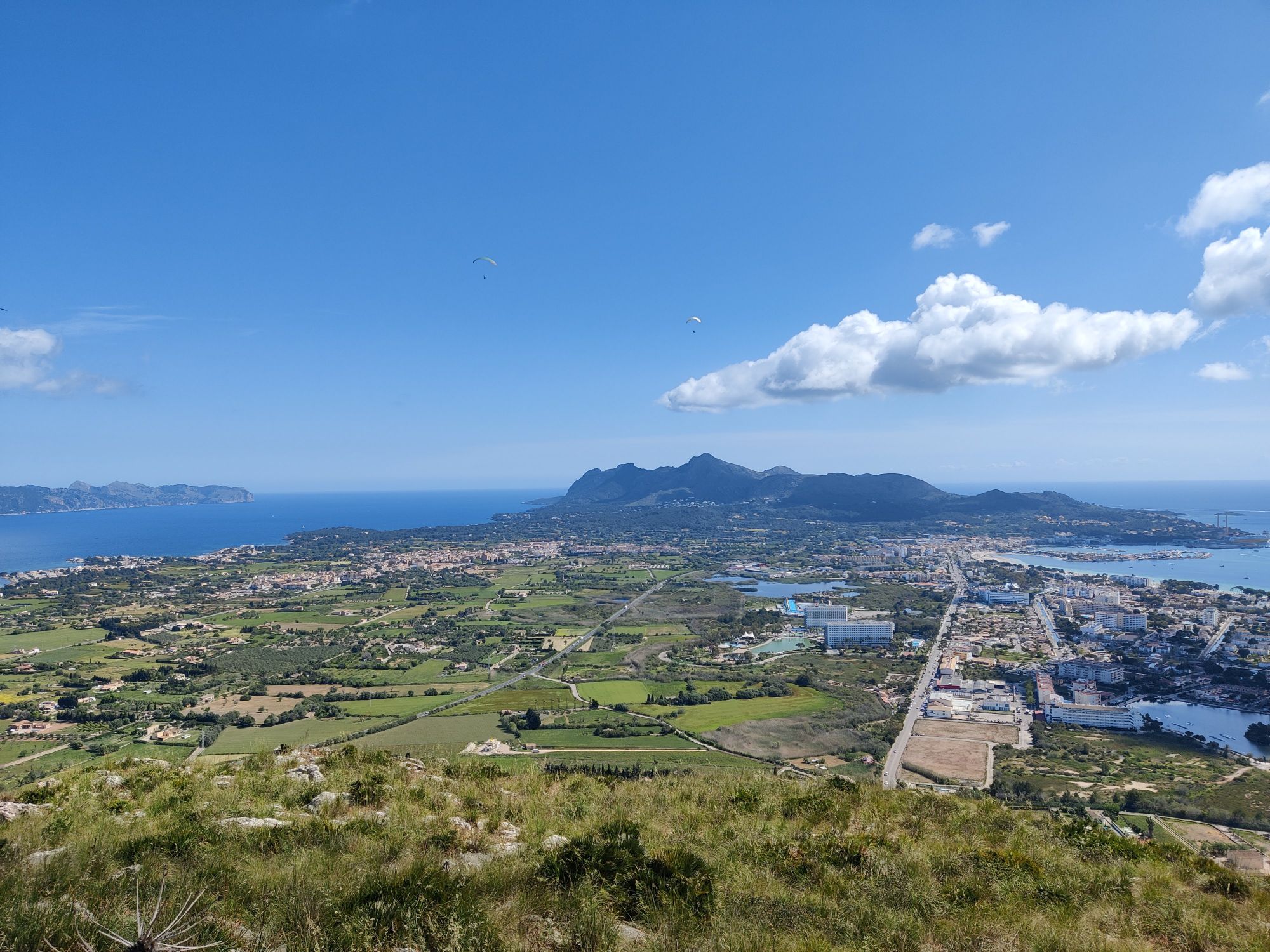 At this junction, turn right onto a narrow asphalt road that climbs steeply to the east. The ascent is steady but short, offering occasional glimpses of the coastline below you. After a bit more than one kilometer, you’ll reach the summit of Puig de Sant Martí (249 m). From the top, you’re rewarded with a panoramic view over Alcudia, Port d’Alcudia, Pollenca, and the higher mountain range to the north, including Puig de Can Groc. It’s an ideal spot to rest, enjoy a snack, and take in the scenery. If you’re lucky with the weather, you’ll also see paragliders taking off from the peak. We stayed there for a while since our two kids enjoyed seeing paragliders.